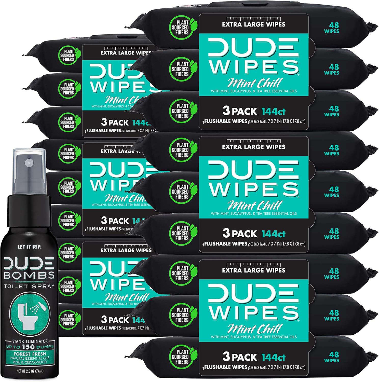 DUDE Wipes - Flushable Wipes with DUDE Bombs Toilet Spray - 18 Pack, 864 Wipes + 1 Spray Bottle - Unscented Extra-Large Adult Wet Wipes with Vitamin-E & Aloe - Forest Fresh Stank Eliminator
